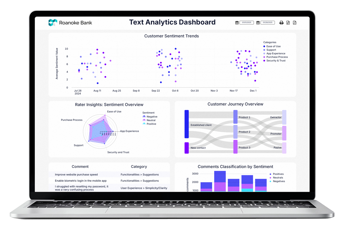 Interactive visuals and analytics reveal what drives satisfaction, frustration, and change.