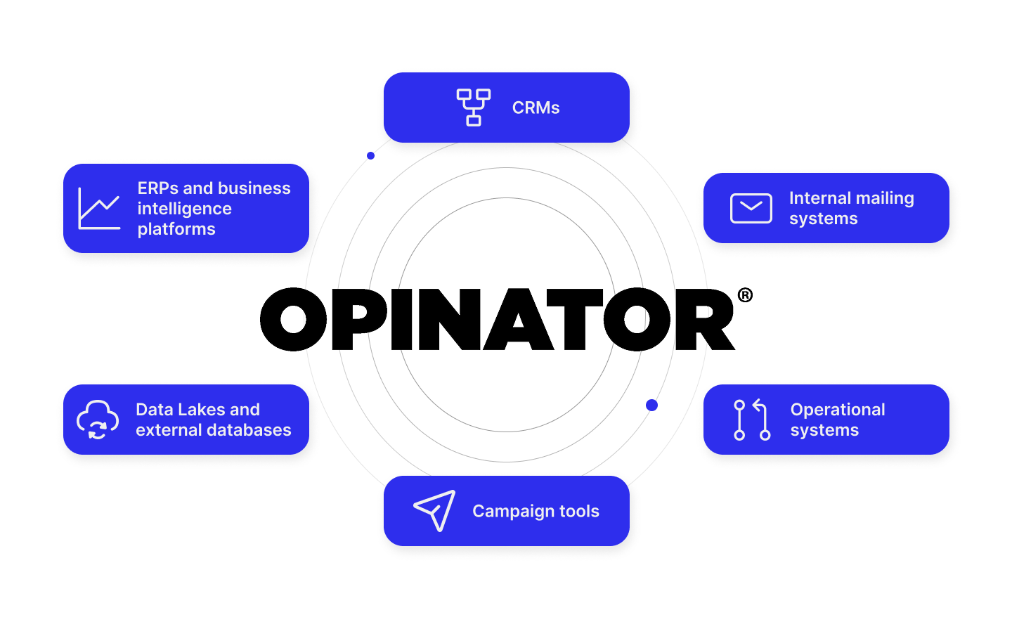 OPINATOR integrates effortlessly with CRMs, ERPs, data lakes, and other business systems, aligning each connection with your specific workflows, data structures, and goals.